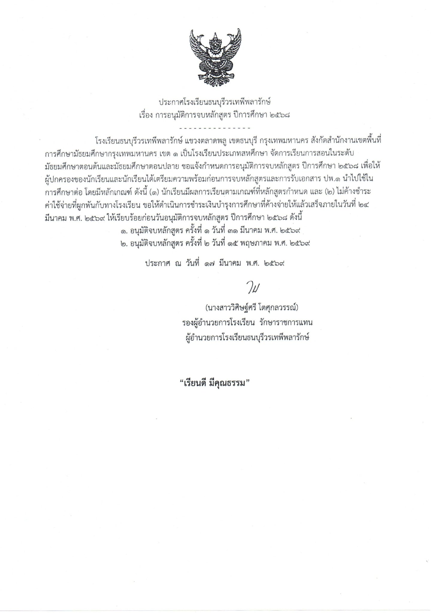 หนังสือประกาศโรงเรียนธนบุรีวรเทพีพลารักษ์ (คลิก) |