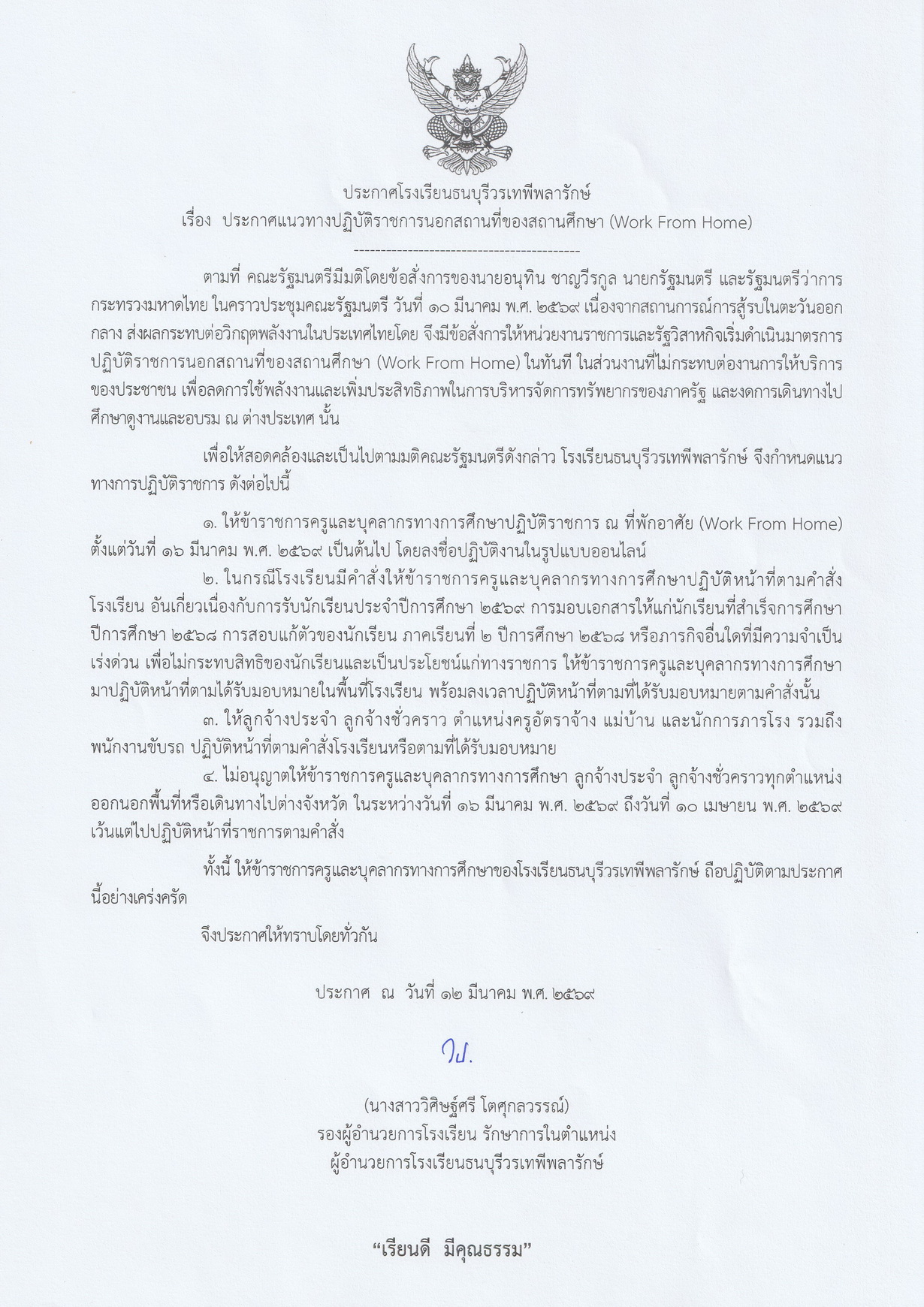 ประกาศ เรื่อง ให้ข้าราชการครูและบุคลากรทางการศึกษา ปฏิบัติงานนอกสถานที่ (Work From Home) โรงเรียนกำหนดให้ข้าราชการครูและบุคลากรทางการศึกษา ปฏิบัติงานนอกสถานที่ (Work From Home) ระหว่างวันที่ 16 มีนาคม – 10 เมษายน 2569 ทั้งนี้ หากมีภารกิจจำเป็นเร่งด่วน บุคลากรที่ได้รับมอบหมายให้มาปฏิบัติหน้าที่ที่โรงเรียนตามคำสั่ง จึงประกาศให้ทราบโดยทั่วกัน